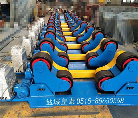 自調(diào)式滾輪架的性能特點 1、自調(diào)式焊接滾輪架主要由主動滾輪架、被動滾輪架、電控系統(tǒng)等組成。 2、主動(被動)滾輪架底座上分別安裝有兩組能轉(zhuǎn)動一定角度的滾輪裝置,兩組滾輪裝置能夠繞其心軸轉(zhuǎn)動一定角度,故隨工件規(guī)格大小能自動調(diào)整從而保證工件旋轉(zhuǎn)時平穩(wěn),連續(xù)。 主動滾輪架上安裝有一套驅(qū)動裝置,驅(qū)動裝置主要由驅(qū)動電機、減速器、聯(lián)軸器、聯(lián)接軸等組成。驅(qū)動電機采用國內(nèi)交流電機驅(qū)動,通過 級蝸輪蝸桿減速機驅(qū)動與兩組滾輪裝置心軸同軸的蝸輪蝸桿減速機,再通過兩組齒輪傳動裝置從而驅(qū)動滾輪旋轉(zhuǎn),工件旋轉(zhuǎn)時能對
